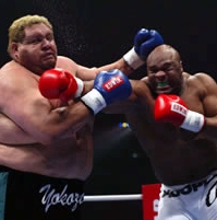 "The Beast" threw some nice low kicks, and when a fatigued Akebono relaxed his guard, got a solid left punch through that stunned the Sumo wrestler. It was a right hook that sent Akebono to the canvas for the first down. But to his credit, Akebono struggled to his feet to beat the count.
