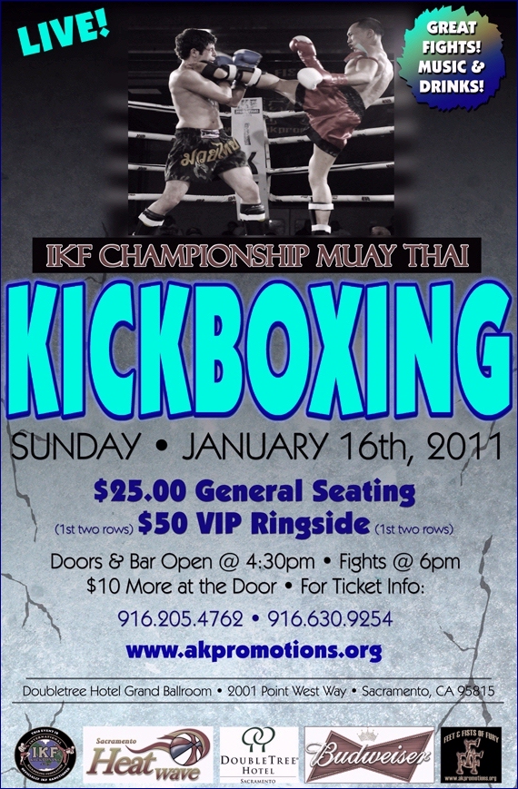 For the first half of the year, AK Promotions is planning an exciting fight season for fans to enjoy the great sport of IKF Muay Thai Kickboxing. Kickboxing is one of the greatest contact sports on the planet! AKP is determined to show the world why Kickboxing deserves to stand beside other contact sports and is always seeking sponsorship partners.