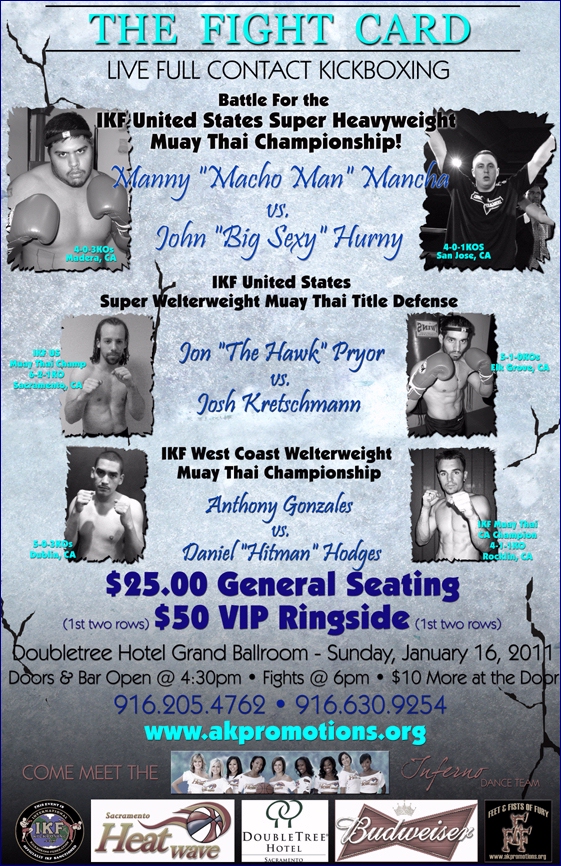 Even more bang for the buck, the highly talented Jon "The Hawk" Pryor of Sacramento will have the toughest fight of his career as outsiders are seeing it against Josh Kretchmann of Elk Grove, CA. Word has it that Kretchmann is the real deal and will take Pryor to the abyss of his inner soul in challenging him for Pryor's IKF United States Title.