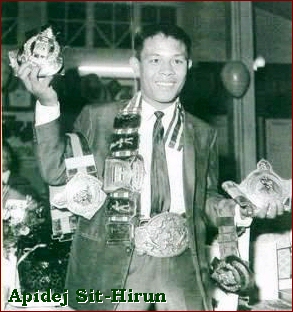 He was also known as "The Man of 7 Titles" - "The Legendary Best Muaythai Kicker of the Century" and "The Best Muaythai Fighter of the Century". Titles awarded by the Authority King of Thailand. Apidej was the first and only legendary Muaythai fighter in Thailand to be recognized and showcased by the Thai National Museum for a "Life Time Achievement" and for making an impact to Thailand's sporting history. An Honorary bronze statue of Apidej is proudly displayed at the Huamark Indoor Stadium, Bangkok, Thailand. Apidej's