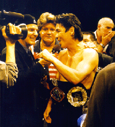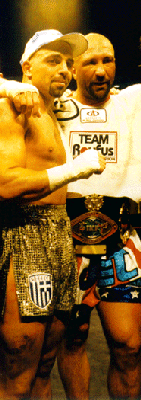 This event was the turning point as to how the IKF gets involved with Pro Purses. Before this event, the IKF had always trusted Promoters and Athletic Commissions when they assured them that the Purse money was honestly going to be paid. And why question these promoters who had already paid Don Wilson in full his $150,000.00 purse and Dick Kimber a $10,000 training fee in January. They had also already paid all the PPV deposits, the IKF helped greatly with the sanctioning fee expenses charging for 5 World Titles, 1 US Title and 6 Title Belts only $2,855.00. The Promoters had also already paid nearly $20,000 in plane tickets for fighters, officials and special guests as well. Although the Massachusetts State Athletic Commission assured the IKF that all the purse money was covered in the promoters license, it was a shock to EVERYONE after the event when none of the Fighters Checks could be cashed and ALL of the checks the promoter wrote to each of them all later BOUNCED! Rick Roufus (Left Below) was on top of the World After Defeating Stan Longinidis and winning his IKF World Title on Live PPV TV at Mass Destruction. However, it was the emotional trauma of not being paid his Purse that would quickly take him out of his winning ZONE! Although Roufus was paid $10,000 in training expenses up front, the Promoter never paid Roufus his actual purse of $91,000. YES, "$91,000!" After the event, promoters were no where to be found, leaving IKF President Steve Fossum alone in the arena with all the fighters and trainers trying to deal with things. The box office which Fossum was told by the promoters would cash everyone's check was closed and the Massachusetts State Athletic Commission had left the building. After an extensive search of the arena, Fossum found co-promoter Scott Haddad. Haddad who was discussing the un-paid purses with Roufus' manager and trainer in a private conference room. While the meeting took place, Dick Kimber (Pictured Below Left) came in and Haddad paid him $10,000 in cash right in front of Fossum, Roufus' manager and trainer. (Kimber had already received $20,000 for training fees around January of 1999 and demanded to be paid another $20,000 in cashiers checks only 3 hours before the event or he wouldn't fight. We were told later that the cashiers checks were for the other fighters. There were many issues that revolved around Kimber's pay as a possible partner of the promotion and when and how he was to be paid but these are all speculated or unconfirmed and now very hard to believe after we have seen the actions taken by the promoters to pay all the other fighters. ESPECIALLY hard to believe since Haddad never brought these issues up when he paid Kimber $10,000 in cash AFTER the event. ) Haddad apologized that he didn't have all the fighters "CASH" on hand but assured everyone their checks would clear that week. Of course... They never did. To make Haddad's credibility worse, he "FAKED" a phone conversation with co-promoter Phil Malonson acting as if Malonson was assuring him he could meet Roufus and Longinidis in the morning with their full purse. However, it was all a bunch of lies as no one ever met Roufus or his trainers or Longinidis the next day. The week after the event, only 2 checks cleared the bank. Curtis Bush's $2,500 purse and Juan Adams check for $1,000. Adams was a fighter who didn't even fight. Some time later, Kevin Rosier was paid half his $5,000 purse. In the end, who didn't get paid? Here's the list;