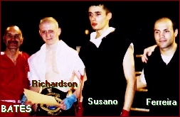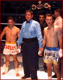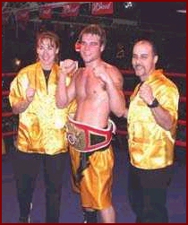 Last night June 25 at the Rodeo Nights in Phoenix Arizona, USA, IKF Light Middleweight FCR World Champion Anthony Bartanalli (Left after win with trainers Rhonda and Clement Vierra and close-up at Right) won a 12 round decision for the Arizona State Super Middleweight Boxing Title. By round 9 Bartanalli had Charles Davis hanging on as Bartanalli continued to hit him from one side of the ring to the other. When the bell rang at the end of the fight, Davis fall to the canvas. Bartanalli looked very good in the bout. Like many other IKF known kickboxers ( Rick Roufus, Juan Torres, Greg Kirkpatrick, Eric Regan and a host of Female Kickboxers ) Bartanalli uses boxing to inhance his ring skills for kickboxing and in the end, has made him a great kick - BOXER. Congratulations |
