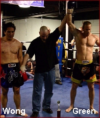 Ever so often a fighter comes along that stands out from the others. All of the nights fighters had their own magic but in the nights main event, it was a trimmed up white kid (Please, not being racists here...) named Dan Green from Provo, Utah, USA that stood out among the others. It wasn't so much his Thai skill in the clinch or his knee work that made Green (8-3/4, 180, 6'1", 27) stand out as was his punching and kicking skills. But there was more. Green's punches looked as straight, quick and solid as watching Roy Jones. His kicks were not just hitting the legs, this kid kicked high and did so with accuracy! Just ask his opponent, Arthur Wong of San Francisco, California, USA. This did not appear like a traditional Thai fight. There was little clinching and when there was, the two broke up. This was more of a K-1 style (No clinching) bout. Wong (9-2/1, 180, 5'10", 27) came into the ring as a favorite against Green with plenty of smoker bout experience (Which in reality, are real bouts) and trained by one of the best in the game, Enn Fairtex. Green is trained by Jason Farrish and together these two put on a show. Our question is where have they been? Green should be going to the IKF Nationals with his skill! Only one flaw came to mind here, if Green would have stuck to his hand combinations from the start, this could have ended in round 1. Regardless, Wong took him the distance but there was no questioning who won. This was all Dan Green by unanimous decision, 48-47, 50-45, 50-45.