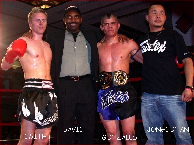 AK Promotions Everyone in the sold out Radisson Ballroom knew there was something big about to happen as Smith and Gonzales entered the ring. The noise made by both teams was deafening! As the bell sounded for the start of round one...there was no feel out game here. They had good back and forth action, landing great kicks and punches to the body and head! Smith was very affective with his front kick to the chest of Gonzales but Gonzales seemed to shrug it off and continued to be the aggressor while finishing his hand combination with hard round kicks to the head of Smith! Smith's solid defense blocked most of them early on! The crowd reacted loudly to each impressive pop of Gonzales' instep and shin as they nearly missed the target and landed hard on the gloves of Smith! Round two and three would be much of the same. Smith landed a hard round kick to the thigh of Gonzales, followed by a strong cross that clearly stunned Gonzales momentarily! Then there was a pause... something looked familiar to this onlooker! It was that same look seen in the Crandle Vs Gonzales match months earlier! In that fight, Gonzales was hurt in the first round and took a standing eight only to come back in the second round to TKO Crandle! Again, Gonzales seemed to be going into another zone! If he were a cat, his eyes would have changed colors as he tilted his chin into his chest and gazed in towards the target like a heat seeking missile! It was like he became "The One" as Keanu Reeves did in the movie The Matrix! Almost everything Smith threw from that point was blocked and, or slipped and then countered with an impressive round kick to the head and body! Seek and destroy became Gonzales' mission as he walked down and sometimes threw down Smith as to say I'm invincible...HEAR ME ROAR! Gonzales then wrapped his hands around the neck of Smith and started a series of knees to the body! The crowd was going wild with excitement as the battle pursued at center stage! One of Gonzales' knees connected hard to the body of Smith and one may have accidentally caught him in the face but for sure the punch or kick that followed put Smith down for an eight count! At the end of the eight count, Smith intentionally spit out his mouth piece to buy more time and was penalized one point by Referee Dan Stell. He was clearly dazed by the assault of kicks and punches from Gonzales! Smith was definitely not willing to quit and was throwing his own brand of outstanding combinations throughout the fight and looked impressive! Some of his techniques were landing clean but Gonzales would not go for it and continued his onslaught! The fourth and final round was here and the audience applauded loudly with approval of this great fight they were witnessing and were happy that they were going to have a chance to see yet another round of great action! It has been said often, 'never slug with a slugger'! As mentioned in a previous article regarding this fight, Gonzales has some of the most talented boxing skills in the amateur ranks of Muay Thai and will always be of great danger to anyone who tries to test him as Nathan did in the fourth round! In the midst of a fury of battle, both men began to land some bombs with kicks and punches and an occasional knee! Then it came... about an eight punch exchange (or should we say "bomb" exchanges) where both men landed some shots but in the end it would be Gonzales' power and accurate jabs, crosses and a huge left hook sent Smith flying into the ropes defenseless and would end the night for Smith! Referee Dan Stell had to jump quickly to put a stop to the punishment before the very dazed Smith was hurt even more! Gonzales look as though he was ready for four more rounds as he was coming in to add the final touches before the stoppage! The crowd came to their feet to show their satisfaction for what they'd witnessed...a great fight between two great fighters! After the fight, Gonzales toured the ballroom with new belt and four foot trophy in hand only to be mobbed by the fans wanting to simply shake the new champ's hand or get a photo op! Its clear they want to see more of Gonzales...sooner rather than later. Sounds like a superstar in the makings! If smiles were worth a million dollars, we would all be rich because the huge smile Gonzales wore on this night was simply - priceless! Nathan Smith must now decide whether he wants to move forward with his plans to turn pro or hang out in the amateurs to see what else is left for him. He is a very talented fighter and will defeat most Welter and Super Welterweights on the planet. However, on this night, he fell a little short but I'm sure we will be seeing more of him in future events! |
