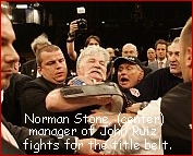 Norman Stone, the Manager of John Ruiz, fought with several people after Valuev won the WBA Heavyweight Title from Ruiz. He literally grabbed the belt away from Valuev after the fight and ran around the ring holding it over his head until five ring bodyguards forcibly took it back. German promoter Wilfried Sauerland accused him of inciting the crowd, leading to the booing. What makes this even worse is that Ruiz was handed the title in April after losing to James Toney, who was then stripped of the crown for testing positive for steroids. In other words, Stone was fighting for something his fighter NEVER EARNED! This isn't the first time Stone has lost his cool in the corner. For one example, back in November of 2004 November 16, 2004, Referee Randy Neumann ejected him from Ruiz's corner after a constant barrage of foul language directed towards him (Neumann). The ejection came in the eighth round. However, boxing won't have to worry about his tirades any more. Stone announced his retirement on at the end of December last year, five days after Ruiz's loss. "I'm done," Stone said. "I'm tired of boxing and last week's bad decision was the last straw. I'm going to relax with my family and spend a lot of time with my two little grandchildren. I'm sorry if my actions sometimes upset people, but I always had John's best interests at heart. It was a great ride." "And speaking of foul-mouthed, Toney looks like a professor of literature when compared to Ruiz's guttural, low-rent trainer/cornerman, Norman "Stoney" Stone. I didn't think anybody could actually do it, but Stoney actually out-foul-mouths two of boxing history's most polluted mouths, the late Al Braverman and the even-later Jimmy DiPiano." - Randy Gordon, thesweetscience.com And to think... The Boxing Writers Association of America named Stone co-Manager of the Year in 2002. A lot of the info in this article came from Kim Murphy, Times Staff Writer - www.latimes.com - MOSCOW |
