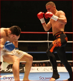 The popularity of the K-1 World Max 70kg/154lbs weight class rivals that of the World GP. Where the heavyweights have the power, the lighter fighters appeal with speed and stamina, consistently producing thrilling contests. This year's K-1 World Max eight finalists represented six different countries. The first quarterfinal was a keenly anticipated matchup between all-round kickboxer and media darling Masato of Japan, who won the Max Belt in 2003; and Thai fighter Buakaw Por Pramuk, whose positively lethal legs and fast fists made him the two-time and Defending Max Champion. Both fighters got the low kicks going early, and the first round had plenty of action -- Buakaw scoring with body blows and a high kick, Masato getting an uppercut in before surprising his opponent with an innocent-looking right straight punch to score a down. The second saw Buakaw good with the hard low kicks, Masato leading with the left straight and deftly picking his spots on the counters, connecting with another uppercut. Masato used the ring to effect, moving to his left, forcing Buakaw to approach with less than perfect positioning. In the third Buakaw needed a down to get back into the fight, but was uncharacteristically tentative with his attacks. Masato meanwhile continued his mastery, focused and fast with the straight punches, closing for another uppercut while absorbing his opponent's low kicks. A fine performance from Masato for the well-earned unanimous decision. The second matchup featured power puncher Mike Zambidis of Greece, a compact bundle of strength and determination; and Ukrainian Artur Kyshenko, a muay thai fighter who also likes the fists. A slow first, Kyshenko with occasional high kicks, Zambidis blocking well and countering with low kicks and body blows -- neither fighter connecting decisively, a slight edge to Kyshenko evidenced on two judges' cards. Better action in the second, Zambidis darting inside with punches but Kyshenko employing his 5cm/2" height advantage to arrest the Greek with long low kicks. In the third, Kyshenko went with the fists, pumping in body blows, while Zambidis launched a couple of flying knees that came up short. Spirited action to end the fight, which one judge gave to Kyshenko and two saw as a draw, triggering a tiebreaker round. A more aggressive Kyshenko in the deciding extra round, in with proficient kicks and combinations; Zambidis meanwhile circling with a hit-and-run strategy, missing again with his flying knees but getting body blows through. A difficult one to call, the decision going to Kyshenko. Dutch boxer Albert Kraus' speed, smarts and punches won him the inaugural World Max Championship in 2002. In tonight's third tournament quarterfinal, the 27 year-old Max veteran met the two-time and Defending Japan Max Champ, kickboxer Yoshihiro Sato. Sato started fast, intent on using his reach and 10cm/4" height `advantage to run Kraus down. But the Dutch fighter was equally aggressive, moving past the straight punches and knees with body blows and uppercuts. Sato sent a number of high kicks up throughout this one, but Kraus' evasions and blocking were sound. In second, a Sato knee looked to have Kraus in trouble, but the Dutch fighter answered with a dandy straight punch and left hook to regain his momentum. The third was thrilling, both fighters repeatedly clashing. Sato again used his long legs to fire the low kicks, and leaped forward with the knees. But a determined Kraus was smart in all aspects of his game -- his movement and positioning were perfect, and he tallied big time late in the round with a punch combination that snapped Sato's head back and, were it not for the ropes, might have put him down. One of the best fights on the night, the unanimous decision going to Kraus. Andy Souwer of Holland set off on the road to glory against muay thai stylist Drago, an Armenian known for both aggression and creativity. |