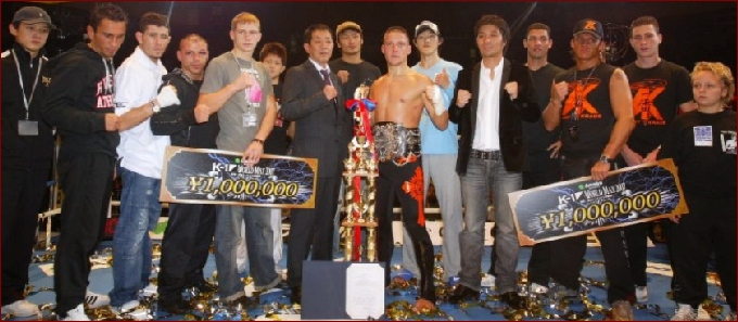 The turning point came late in the round, Souwer smashing in a right straight punch, catching his off-balance opponent with a number of hard low kicks. At the clapper Souwer was chasing the retreating Japanese fighter, and when the bell sounded Masato slowly slumped over the ropes, hurt and exhausted. The ringside camera stayed on Masato between rounds, and the question now was whether he could answer the bell for the third. The time ticked off, the announcer called 'seconds out,' but Masato's cornermen remained huddled round their seated fighter, who had pain tattooed on his face. A quiet, mournful shake of the head and the hint of a smile from Masato. It was over. Souwer leapt in the air, then dropped to the canvas and bowed to Masato, lifting the Japanese fighter to his feet as the crowd rose to theirs to offer both warriors a standing ovation. In his post-fight interview, Masato told reporters that injuries to his hand and legs from his bout against Buakaw had badly limited him in his subsequent fights. Commenting afterward on his strategy for the final, Souwer said, "My trainer Andre Mannaart and I knew Masato wanted to rush me with punches, so we had this plan to use kicks. My ribs and my ankle were hurt in my fight with Kraus, and my right hand was also causing me pain, but I had to give my all against Masato, who is one of the best!" With the victory, Souwer reclaims the Belt he surrendered to Buakaw last year, and also picks up a cool 20 million (not US) in prize money. "My second son was born just last week," said Souwer, "I will put this money in the bank for him and his brother." In the Reserve Fight it was Takayuki Kohiruimaki of Japan vs Virgil Kalakoda of South Africa. Kohiruimaki wanted the distance to throw his kicks, but Kalakoda kept moving inside with the fists. Kohiruimaki had said in the pre-event press conference that he would "find the right position" to defend against Kalakoda's punches. Unfortunately for the fans, the position he choose was the clinch, prohibited under K-1 rules. This got Kohiruimaki numerous warnings and a yellow card. Kalakoda had the much better strikes, several straight punches and a right hook in the second then a left straight in the third for a down. After the count, Kalakoda pounded in tight hooks for another down and the win. In a Superfight, seidokaikan fighter Kazuya Yasuhiro of Japan took on kickboxer Su Hwan Lee of South Korea. Fast and furious this one, the fists seeing action, Yasuhiro getting a right through in the first, Lee scoring a down with a left. Lee took the fight to his opponent in the second, scoring another down with a left hook, snapping in the low kicks and ducking a desperate spinning back punch to stay out of harm's way. Yasuhiro has great heart, and kept coming at the Korean, but couldn't muster the down he needed to get back into the fight, which went to Lee by unanimous decision. A special junior 60kg Superfight saw 15 year-old Japanese kickboxer Hiroya take on 18 year-old Kwon Eolzzang of South Korea. An estimable contest, the youngsters showing impressive technique and speed. Both put the good low kicks in early, Hiroya scoring with combinations and a nice right overhand, and planting a couple more hard punches in the second. Eolzzang got his stuff going at times, but Hiroya used superior footwork, positioning and speed to put more muscle on the money, earning a comfortable unanimous decision. In undercard action, Japanese fighter Gori beat compatriot Ryogi by unanimous decision; and Murat Direkci of Turkey scored a second round KO victory over Satoruvashicoba of Japan. The K-1 World Max '07 Final attracted a sellout crowd of 14,231 to the Nippon Budokan and was broadcast live across Japan on the TBS network. For delay broadcast information in other areas contact local providers. For complete coverage of this and all K-1 World Max and World GP events visit the K-1 Official website (www.k-1.co.jp/k-1gp).