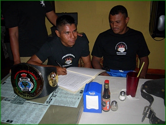 The IKF represented in Mexico by Felix Perez (L) has announced a Triple Main Event Muay Thai fight card scheduled for Saturday, October 31st at the Plaza De Toros La Paloma. This was the site of a huge event almost 4 years ago held by the IKF at the same venue that saw Puerto Vallarta fighters win world championships and Mexican championships. At stake at this event are three IKF Mexican Muay Thai belts announced by Ketzal Productions Director General Felix Reno Perez Ponce at a recent press conference. The triple main event has Puerto Vallarta's Cesar "El Mego" Palomera, already a belt holder in the welterweight division, moving up in weight to attempt to capture the vacant IKF Super Welterweight title against Jose Francisco "La Sombra" Ramos of Mexico City. Palomera, fighting out of Sityodtong Gym, enters the bout with a record of 9-1. Also a champion with a CNKB title, Puerto Vallarta's Gregorio "Dragonsito" Gabriel (11-1) of Dragon Manzanarez Gym will battle for the IKF Featherweight title against veteran Eduardo Santos Moreno of Mexico City in the second of the main events. In the third main event Carlos "El Metralleta" Solorio, owner and maestro of Lanna Gym in Puerto Vallarta will fight Ricardo Neftali "Jerry" Garcia of Irapuato, Mexico for the vacant Super Lightweight IKF title. Solorio is 20-7 and Garcia comes into the bout with a record of 11-2. The undercard will have four other professional fights and each features a fighter from Puerto Vallarta. Hugo Solorio of Vallarta will battle Daniel "El Pony" Villegas Ruiz of Mexico City in the featherweight division. Pedro "El Kick" Camberos of Puerto Vallarta will fight Ismael "La Piedra" Gomez of Mexico City in the welterweight division. Two fighters making their professional debuts will fight in the middleweight class, as Josue Ruelas of Vallarta is pitted against Candelario Torres Reyes of Mexico City. Two women's fighters will battle in the lightweight division as both fight their second career bouts. Following in her Dad's footsteps is Yajaira "La Princesita" Manzanarez, who was a dominating success in her first fight, facing Wendy Peña; both of Puerto Vallarta. Yajaira is the daughter of Santiago "Dragon" Manzanarez, (Right) who won the IKF Pro international Rules Middleweight World title at the same venue four years ago on November 27th, 2004 when he defeated Fernando Calleros of El Paso, Texas, USA by Split Decision, 97-99, 98-92 and 97-94. Although he wanted to participate in this event, Manzanarez is recovering from a leg injury. The fights begin at 7:00 PM on Saturday, October 31st. Tickets are priced at $130 pesos presale and $160 pesos at the door. Tickets are available at El Torito Sports Bar and Restaurant at 222-3784. Tickets are also available at Dragon Manzanarez Gym and Lanna Gym.