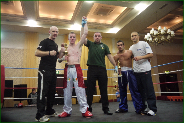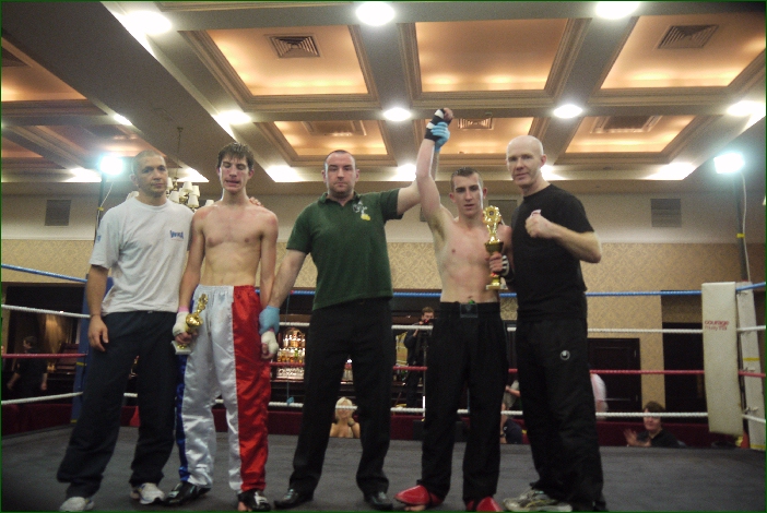 The last fight of the night featured IKF World Light Heavyweight champion Cathal Manning and he faced up to Frances Anthony Pinto. Manning opened the round with some powerful kicks to Pintos midsection that could be heard all around the venue but Pinto fired back and it was shaping up to be a really good fight. That is until midway through the round, Manning caught the Frenchman with a savage left hook to the body. Pinto went down hard to the canvas where he stayed and was counted out by Referee Mick Burke from Dublin. Immediately after the count referee Mick Burke called for the ringside doctor. The doctor revealed that at least one of Pintos ribs was possibly broke and the Frenchman will be out of action for quite a while. Manning, who is this years Galway Bay FM sports star of the year for Kickboxing added yet another knockout win to his impressive CV and the Black Dragon gym had shown that their fighters can mix it up with the best.
