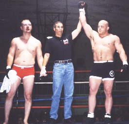IKF GEORGIA: On Saturday, February 24, 2001, IKF & ISCF Promoters Mike (IKF Georgia Representative & ISCF World Representative) & Elizabeth Carlson (Both Pictured Right with Marika) of Augusta Georgia, USA Promoted what IKF President Steve Fossum called "The most organized event the IKF has EVER Sanctioned, Winter Wars 2001!" "This is not to downplay ANY other IKF or ISCF Promoters," said Fossum, "but this was clearly the first time that I have ever attended an IKF event and did nothing. The Carlson Team handled everything from pre event weigh-ins to ringside officials and scorekeeping. They invited me there to be a guest, but I was thinking, heck, I'm sure I'll be doing something, but there was nothing I needed to do. What a GREAT TEAM Effort on their part." In front of a record crowd of over 1,200 spectators, thirty-six kickboxers and submission fighters battled for victory at Fort Gordon's Gym 1 in Augusta, Georgia. This years Winter Wars 2001 event was held, following a successful daytime karate tournament which included kata, weapons kata, sparring, grappling, and submission sparring divisions. The daytime tournament was sanctioned by the Professional Karate Commission (PKC) and had more than 120 participants. The evening event featured kickboxing bouts sanctioned by the International Kickboxing Federation (IKF)) and the (PKC). The International Sport Combat Federation (ISCF)) sanctioned the mixed martial arts bouts. In addition to the eighteen exciting bouts, the crowd was treated to a virtual who's who in the martial arts world. Mr. Steve Fossum, IKF and ISCF President, was in attendance, as well as Mr. Glenn Keeney, PKC President. Mr. Cary Wilson, CEO and Chairman of Midori Yama Budokai (MYB) was present at Winter Wars 2001 and Mr. Joe Corley, owner of several Atlanta-based karate schools. |